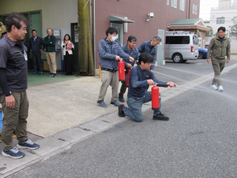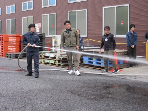 消火器や消火栓の使い方を復習し、担当者全員が実際に操作をして確認をいたしました。